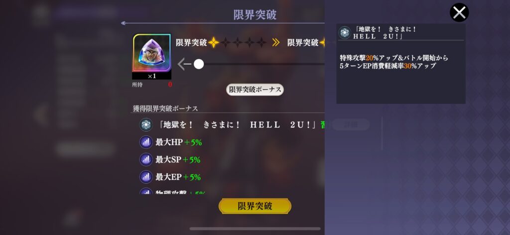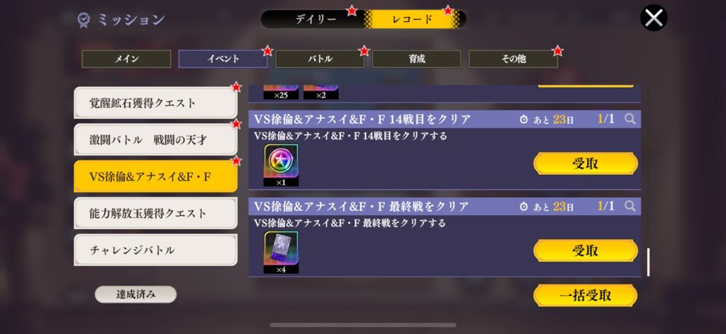 基本、ガチャで同じキャラを複数入手して限界突破しますが、本イベントを制覇することで好きなキャラの凸を増やせます。